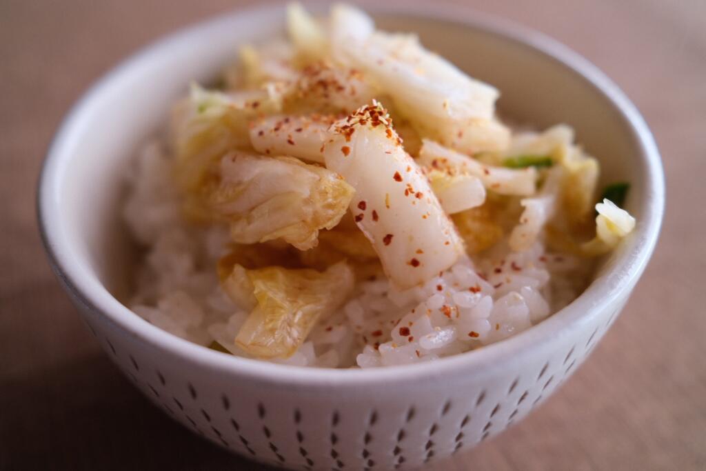 近所の八百屋に売っている白菜漬けに軽く醤油と一味唐辛子を掛けて、炊き立てご飯に載せただけなんだけど、ご馳走すぎる。お碗は小石原焼のカネハ窯の作。