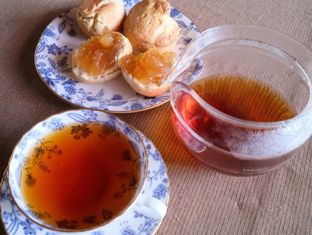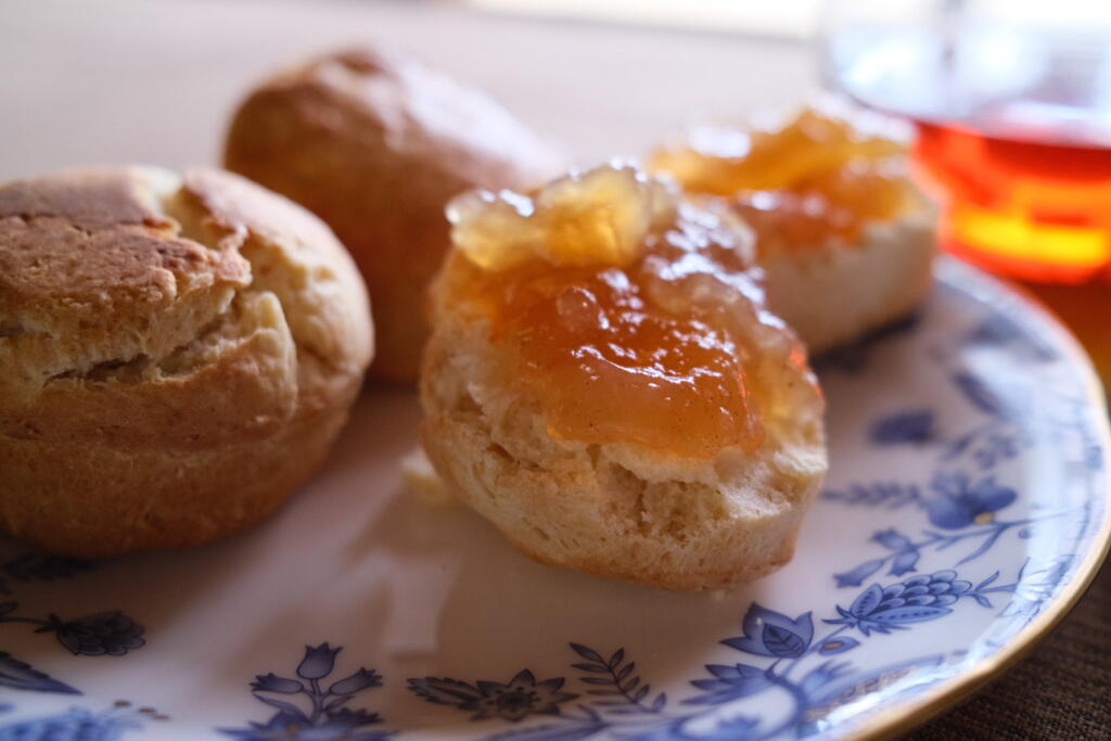 こちらのスコーン的な何かは自家製、上のジャムは業務スーパーで売ってたアップルシナモンジャム。